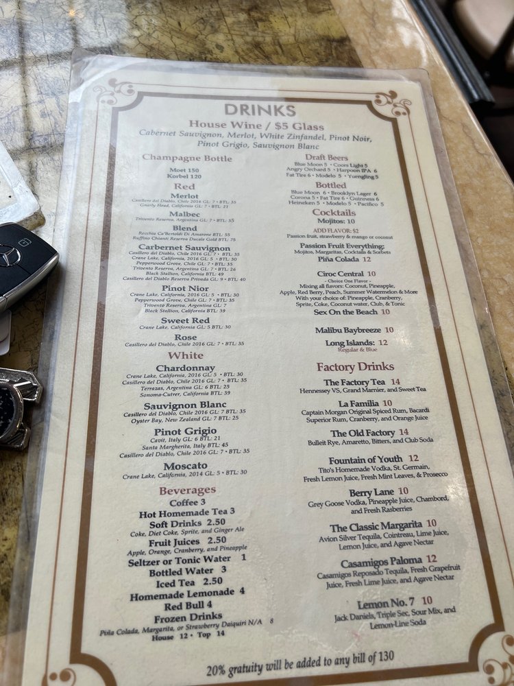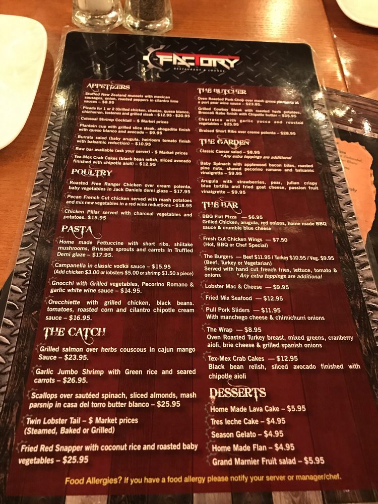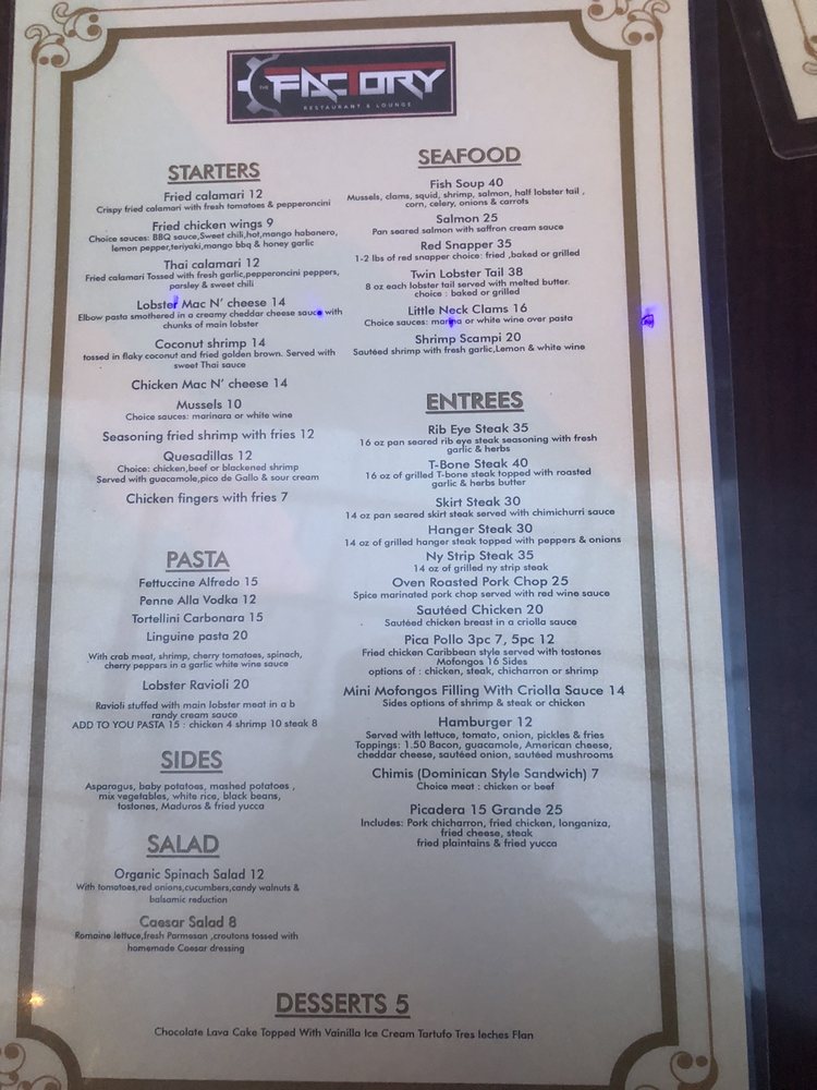 Introducing The Factory, a trendy and classy New American restaurant in Cy Cy, NJ. Known for its diverse menu offerings, The Factory boasts a selection of mouth-watering entrees like the Beef Burger with customizable toppings, Mofongos in various protein options, and the classic Turkey Burger. The appetizers are equally enticing, with options like Beet Salad, Buffalo Calamari, and Thai Calamari. Dessert options include Grand Manier Fruit Salad and Homemade Lava Cake, among others. Customers praise the cozy ambiance, affordable prices, and delicious drinks. The Factory is perfect for group gatherings or a dinner date. Don't forget to check out their happy hour specials and enjoy the full bar offerings. Whether you're looking for a casual dining experience or a place to dance, The Factory has something for everyone. Visit soon for unforgettable flavors and a great time.